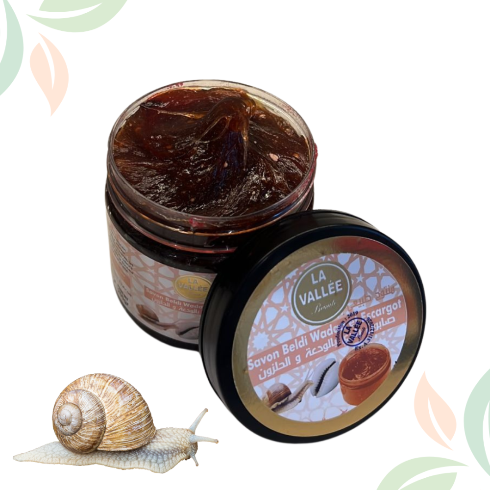 دللي بشرتك مع الصابون البلدي المغربي بالودع والحلزون، تركيبة فريدة تجمع بين مفعول الودع في تفتيح البشرة وتنقيتها، وقوة مستخلص الحلزون في تجديد الخلايا، محاربة التجاعيد، وترطيب عميق.